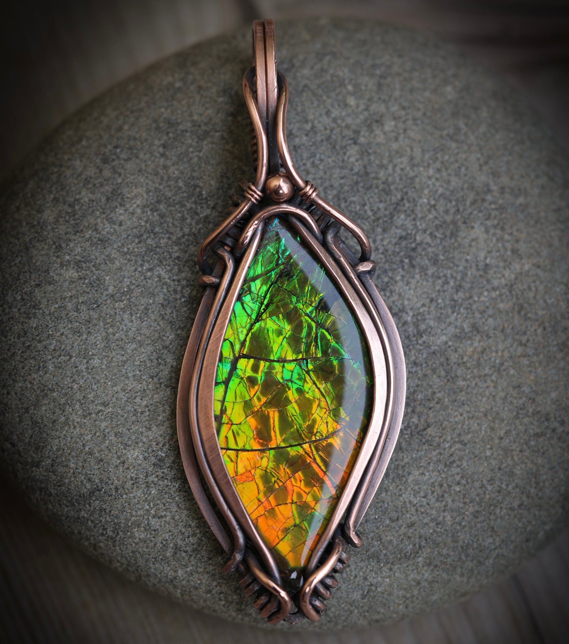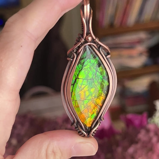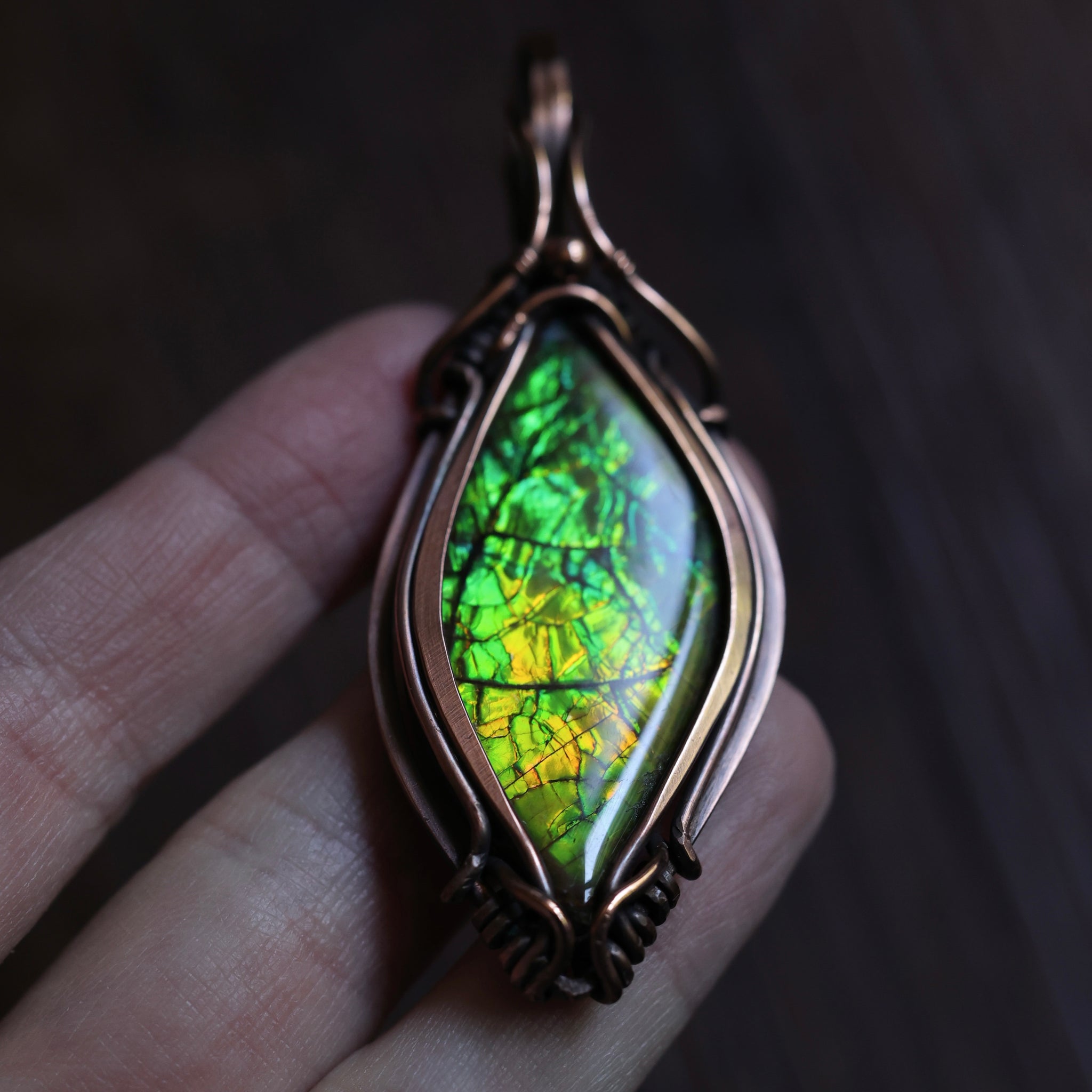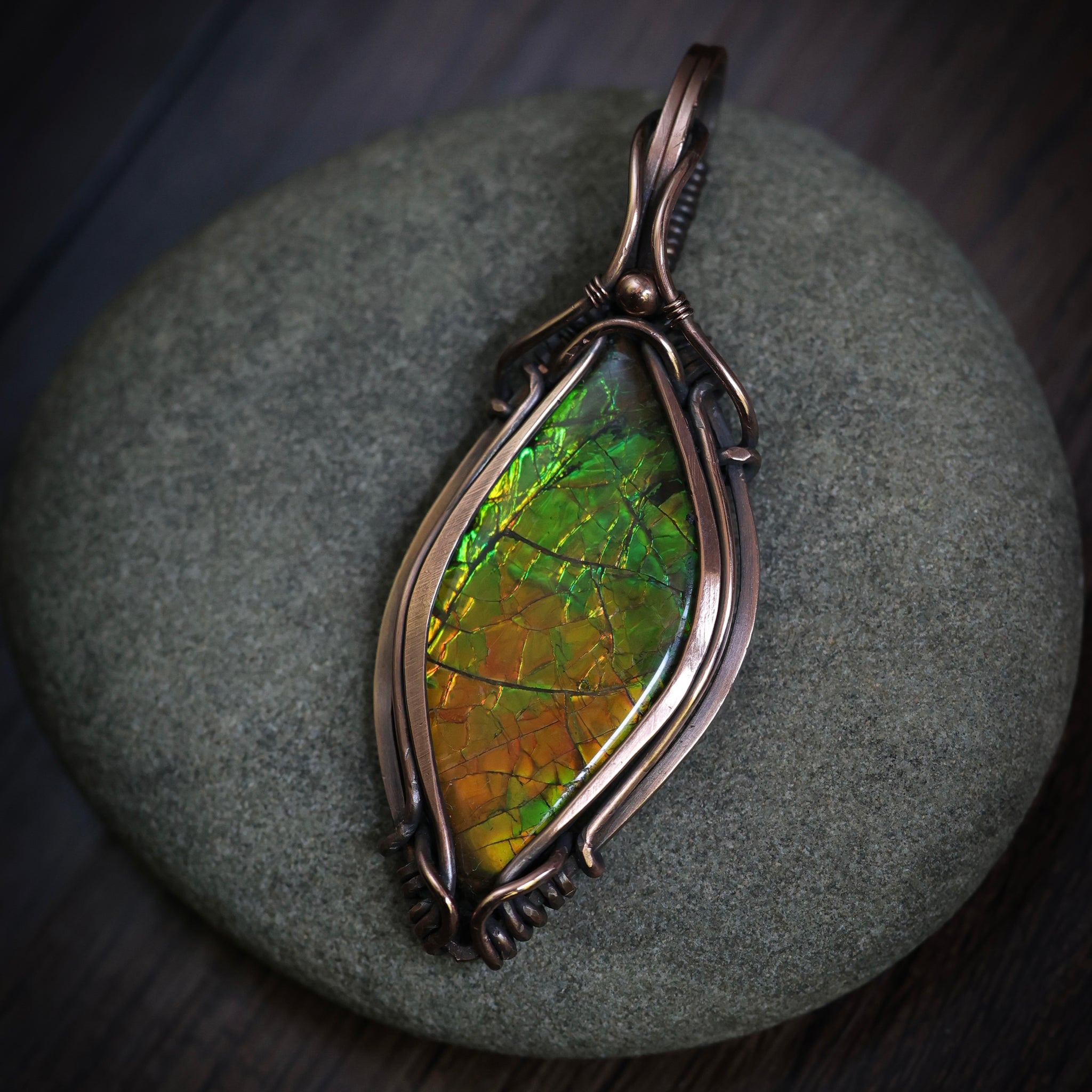 This gorgeous grade Ammolite, is uniquely wrapped in hammered, filed antiqued/ hand polished thick copper wire, into a beautiful healing talisman pendant. With an amazing flash of green, red and yellow, this pendant measures approx 7.6cm from the top of the bail to the bottom and is approx 3cm at it widest point across.