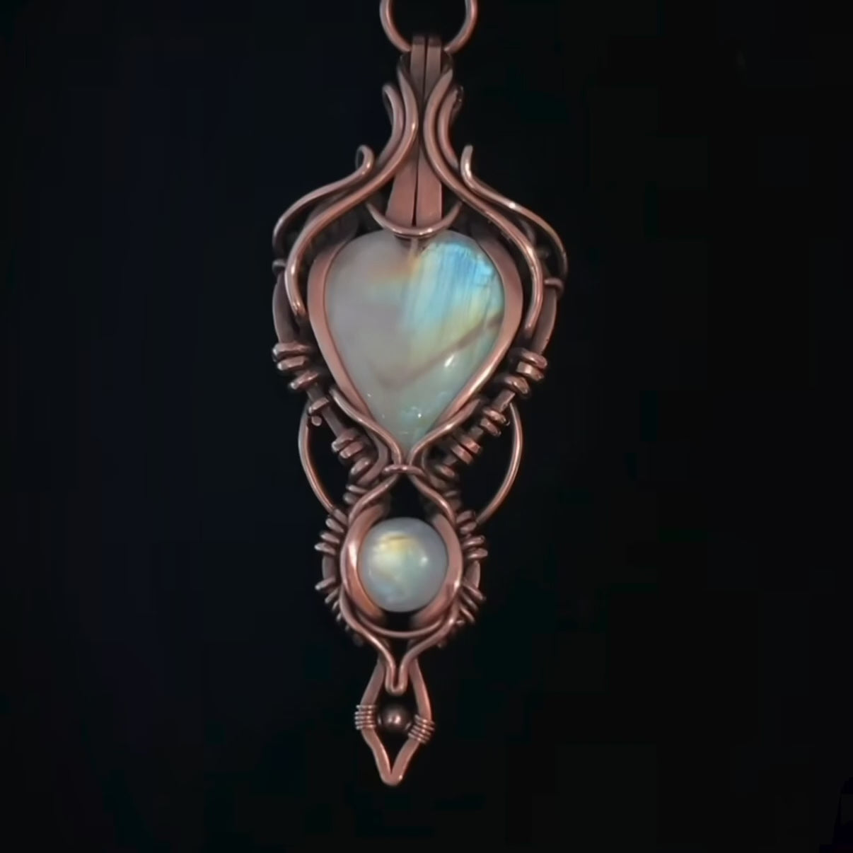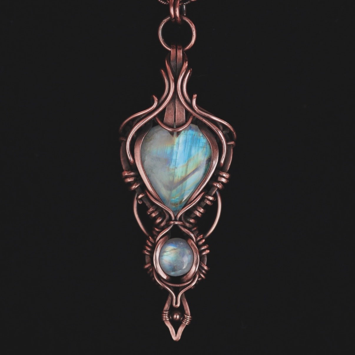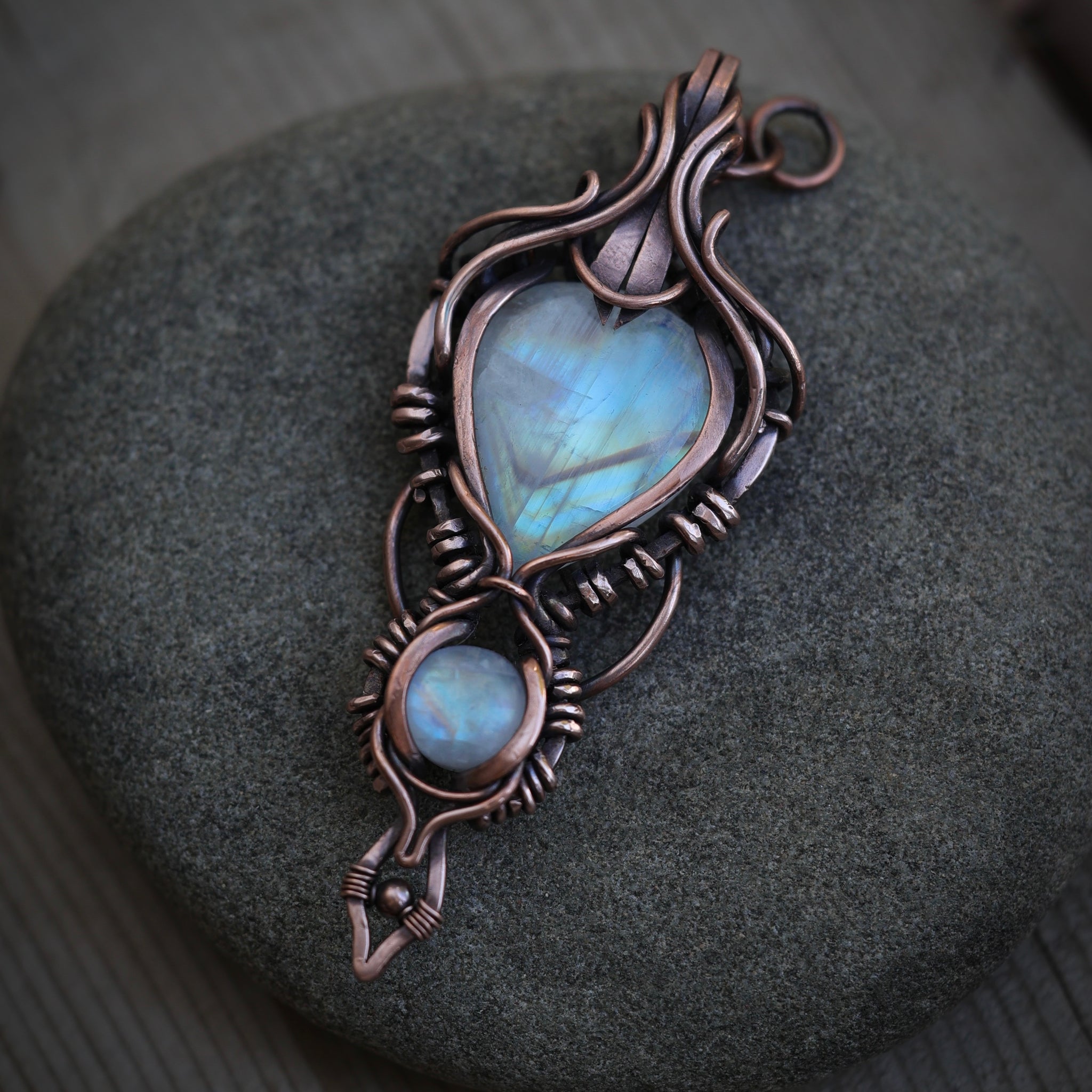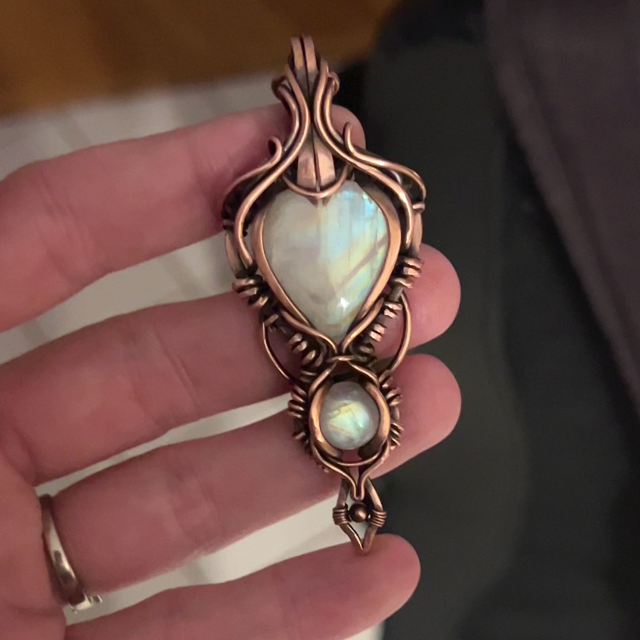 This beautiful piece, with not only one, but TWO beautiful, flashy moonstones wrapped in hammered, filed antiqued/ hand polished copper wire, into a unique one of a kind, healing talisman pendant. Measures approx 7.4cm from the top of the bail to the bottom and is approx 2.9cm at it widest point across.