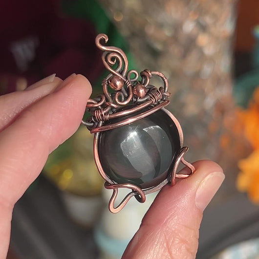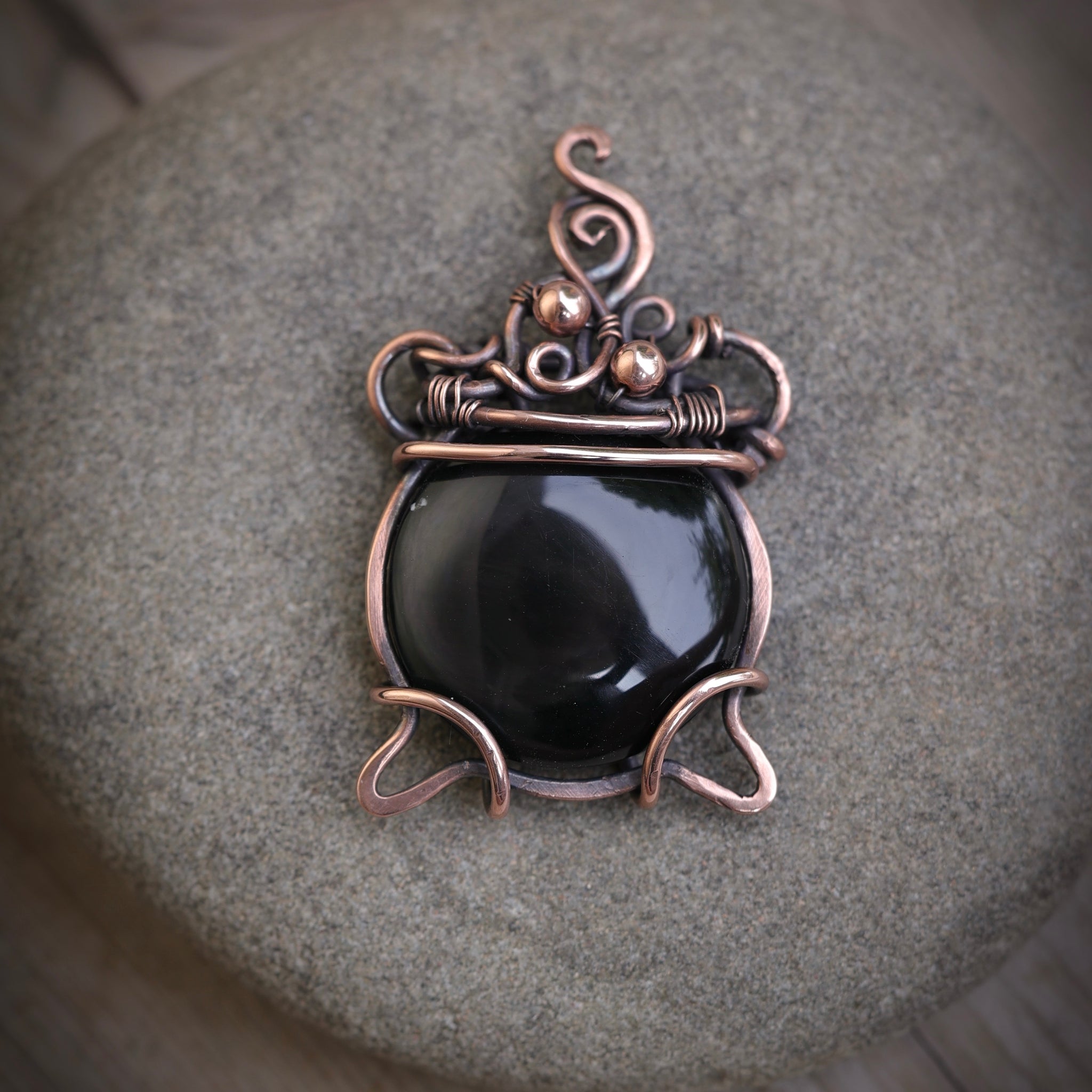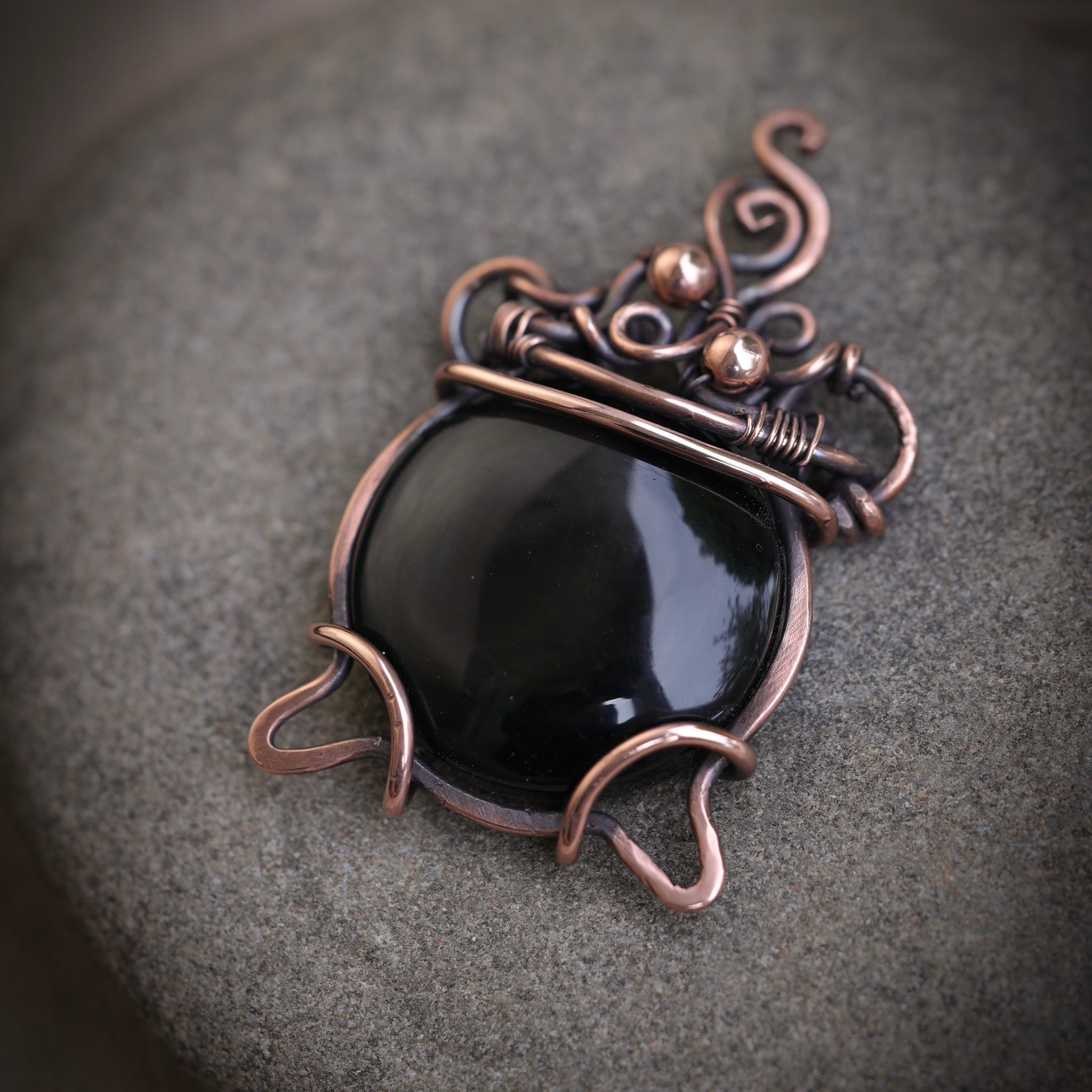 Rainbow Obsidian wrapped in antiqued/hand polished copper wire, into a beautiful unique one of a kind healing talisman cauldron pendant.   Measures approx 4.8cm from the top of the bail to the bottom and is 2.8cm at it widest point across.