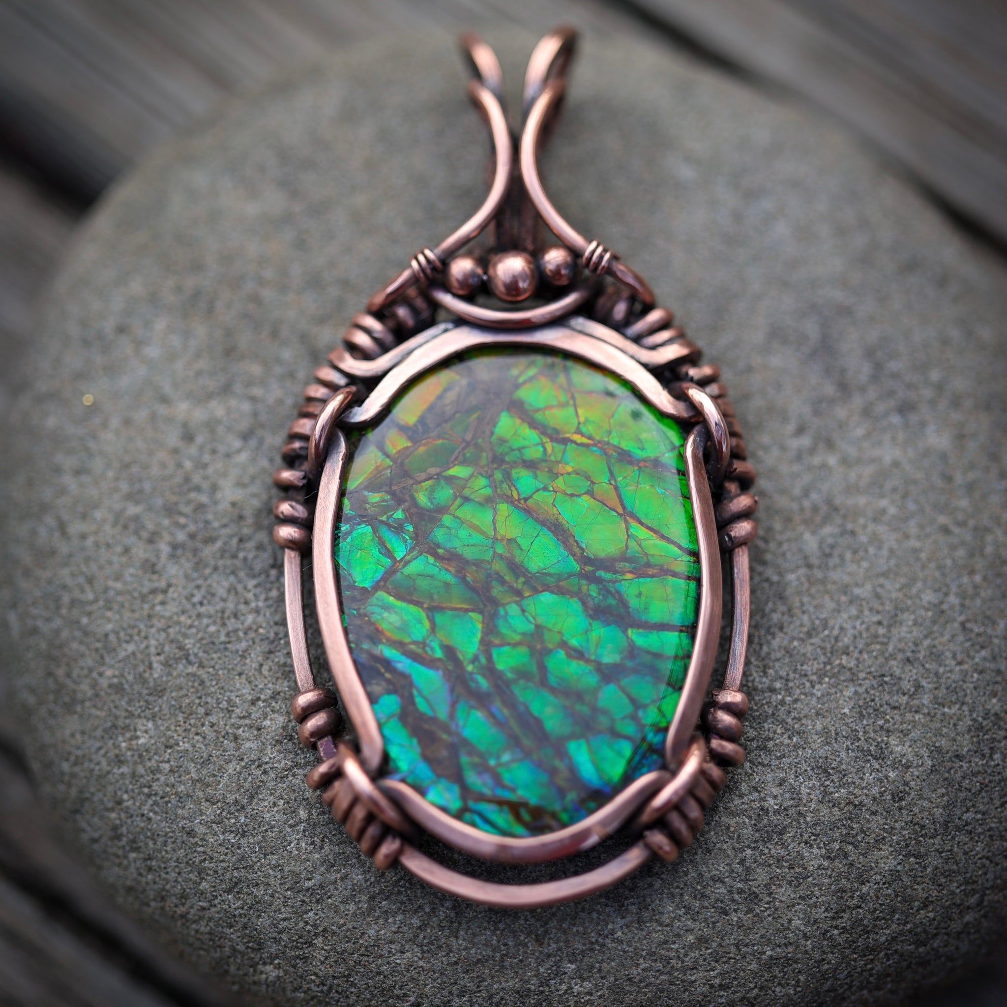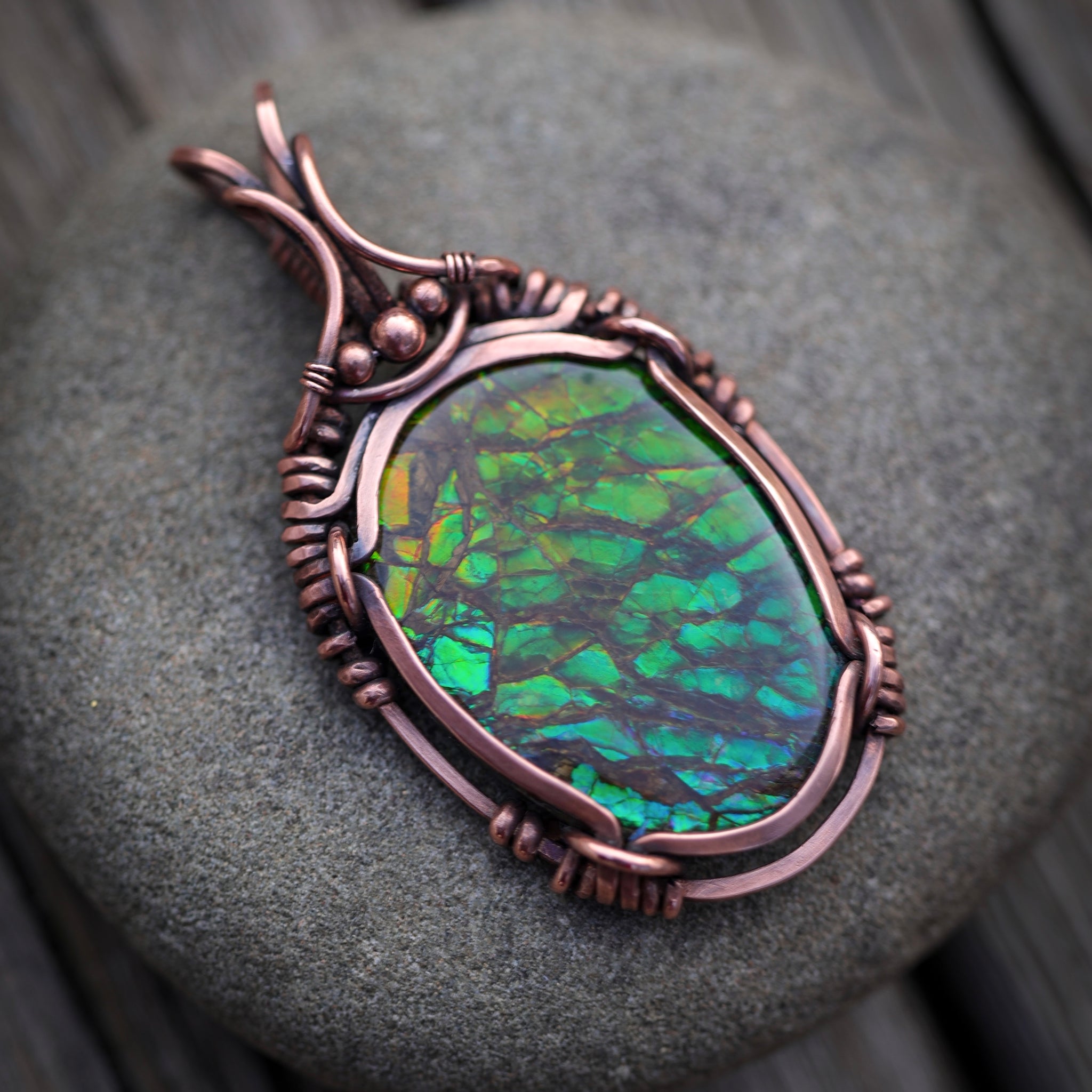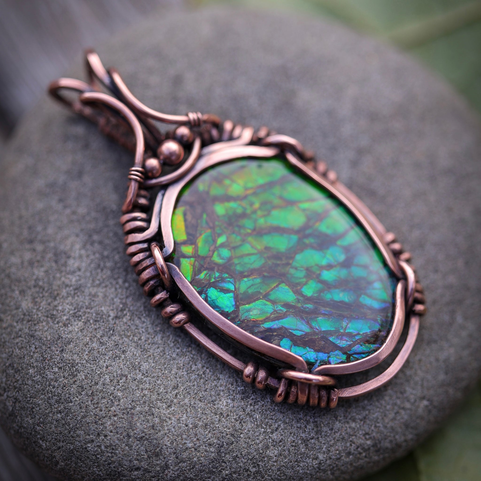 This gorgeous piece of Canadian Ammonite, is uniquely wrapped in hammered, filed antiqued/ hand polished thick copper wire, into a beautiful healing talisman pendant. With a flashy dragon scale pattern, this pendant measures approx 6.5cm from the top of the bail to the bottom and is approx 3.4cm at it widest point across.