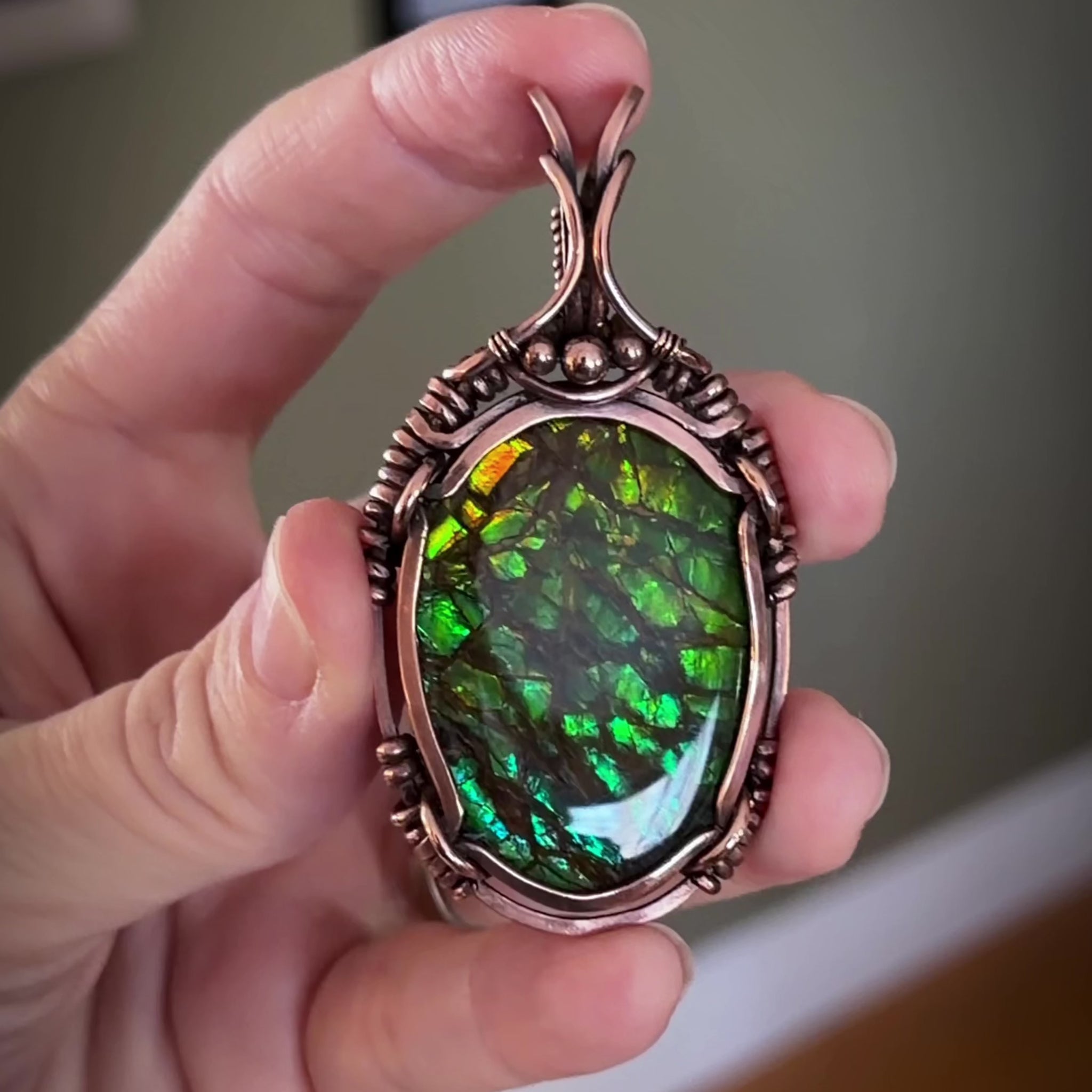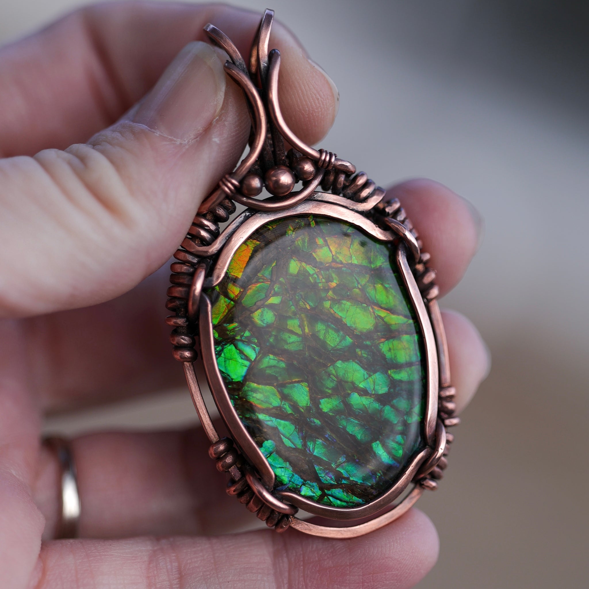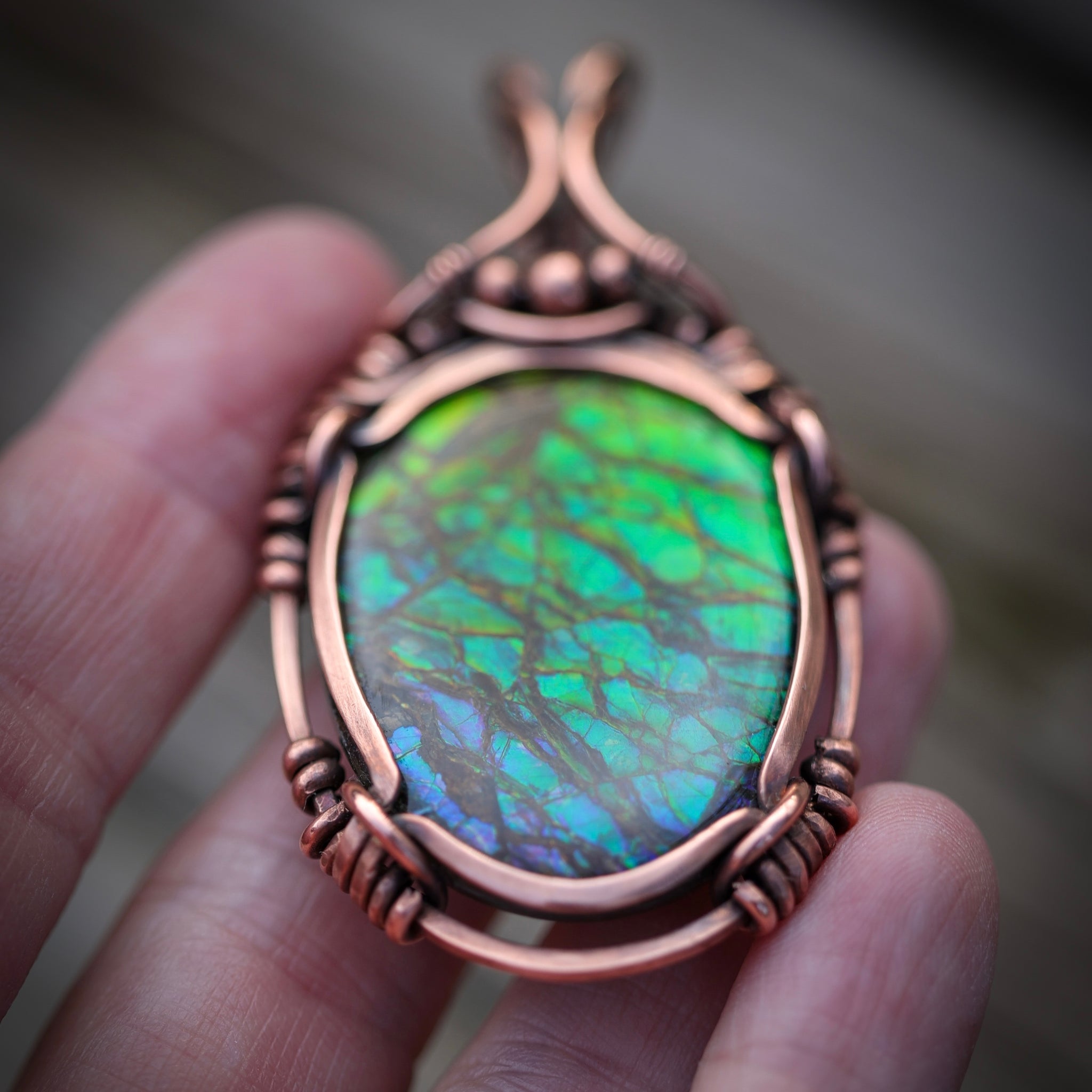This gorgeous piece of Canadian Ammonite, is uniquely wrapped in hammered, filed antiqued/ hand polished thick copper wire, into a beautiful healing talisman pendant. With a flashy dragon scale pattern, this pendant measures approx 6.5cm from the top of the bail to the bottom and is approx 3.4cm at it widest point across.