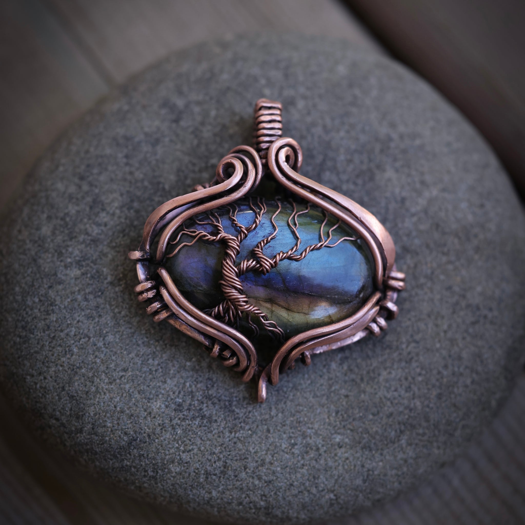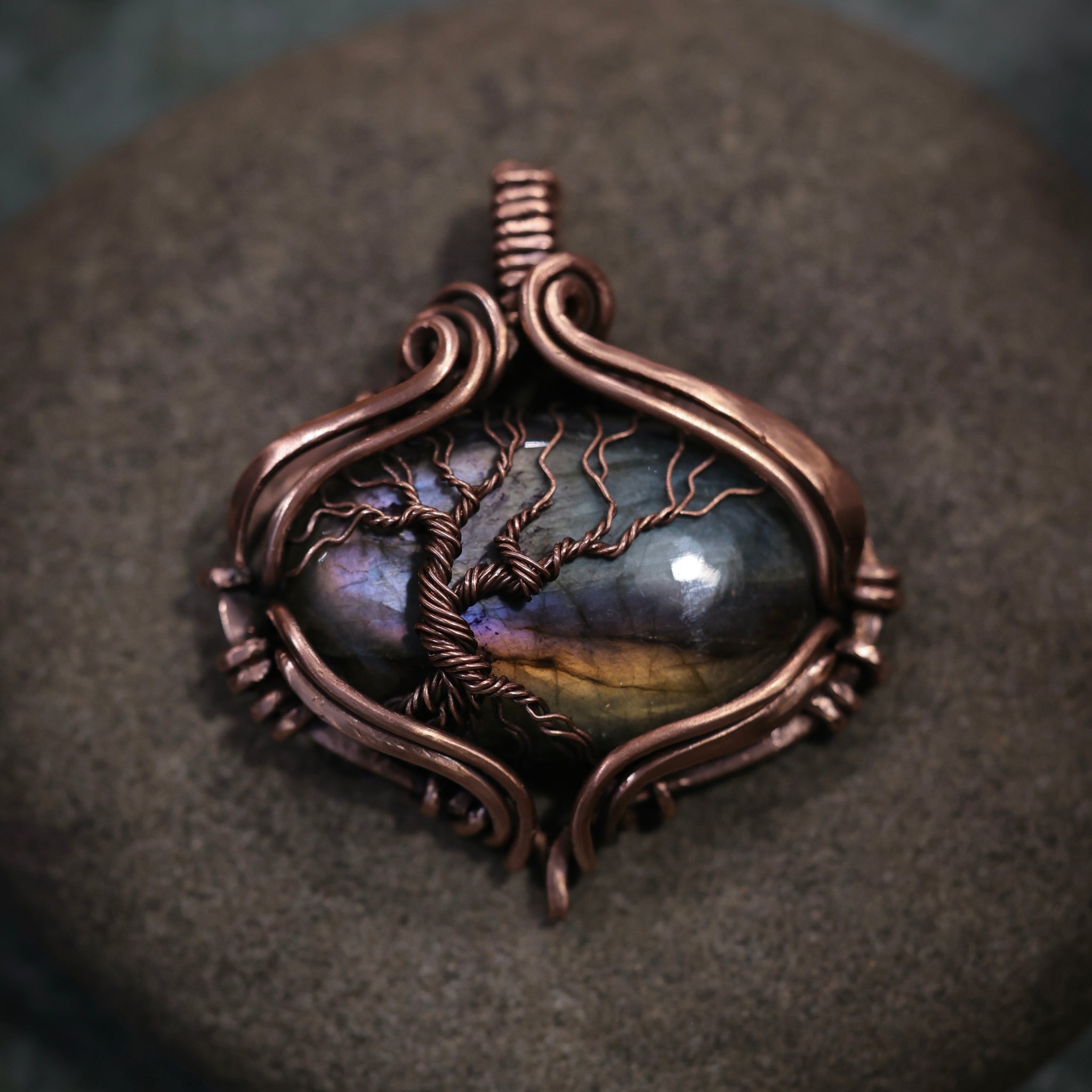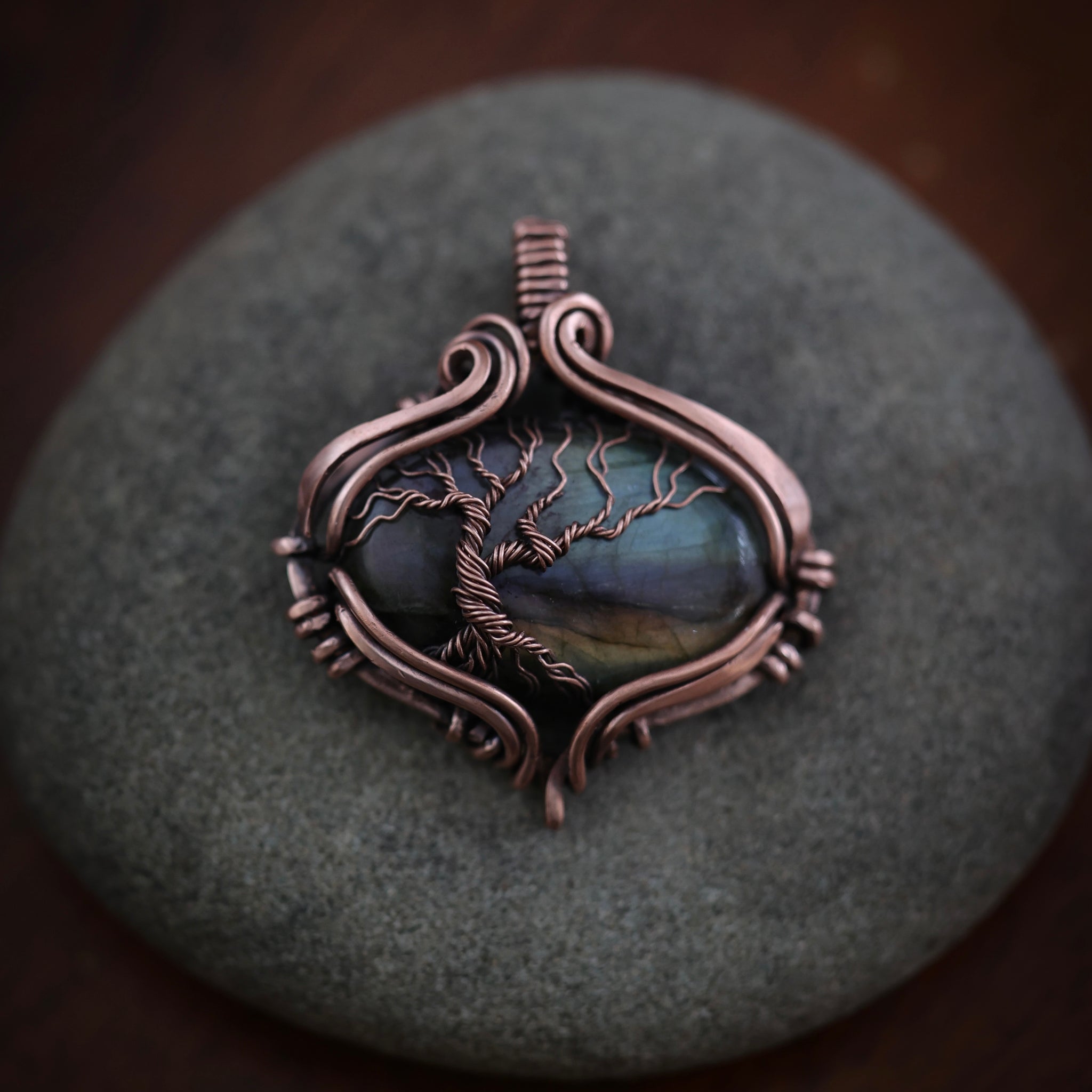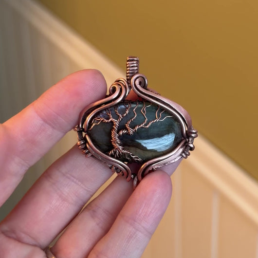 This beautiful Labradorite, is wrapped in hammered, filed antiqued, hand polished copper wire, into a one of a kind whimsical healing tree of life pendant. Measures approx 4.6cm from the top of the bail to the bottom and is 4.4cm at it widest point across.